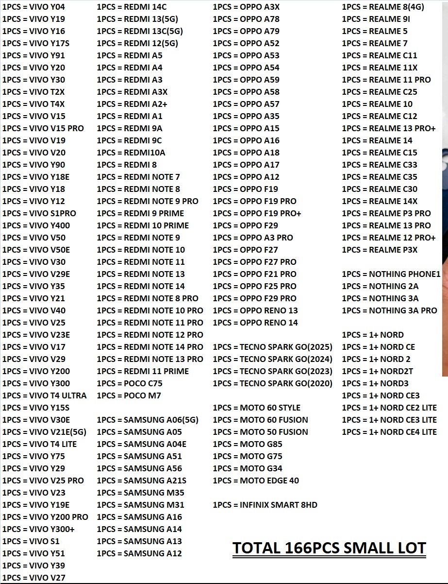 | 1PCS = VIVO Y200 PRO | 1PCS = SAMSUNG A16 | TOTAL 166PCS SMALL LOT | |